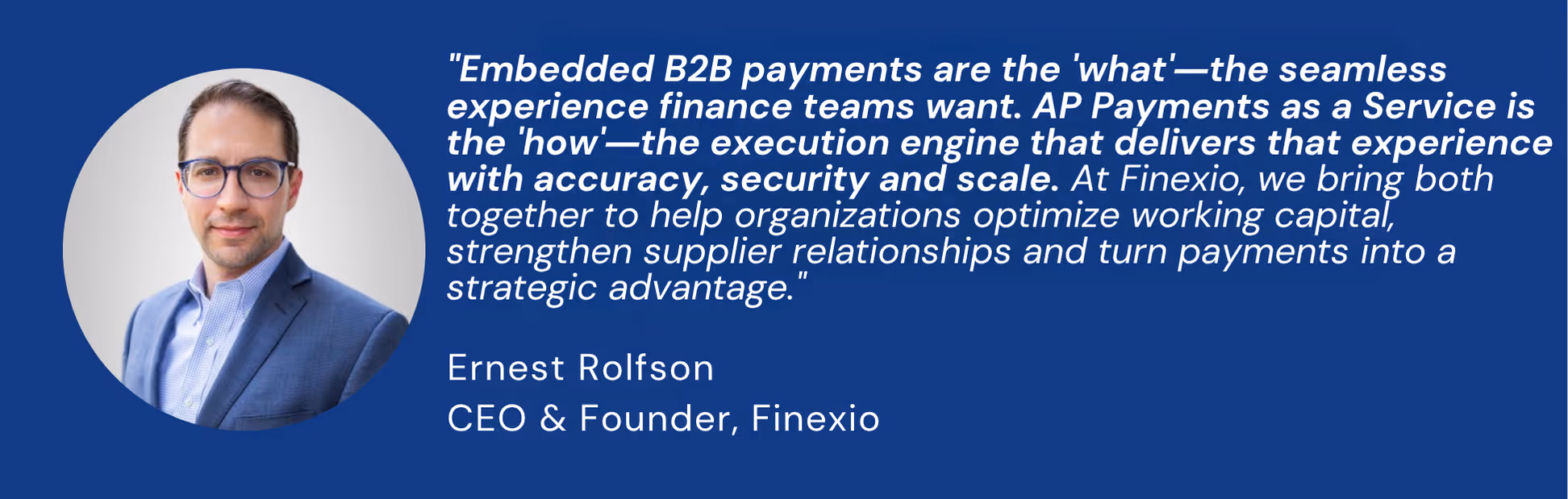 Think of it this way: Embedded B2B payments provide the front-end user experience, while AP PaaS is the infrastructure that executes and manages each transaction seamlessly, securely and at scale. True transformation goes beyond simple automation—it involves offloading execution and operations to embedded B2B payment service providers while retaining control and visibility.