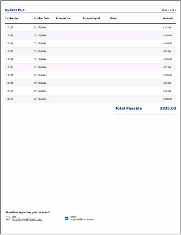 Finexio has enhanced its checks remittance emails by including a PDF document in the remittance email, which will list all invoices when the payment covers more than 5 invoices.